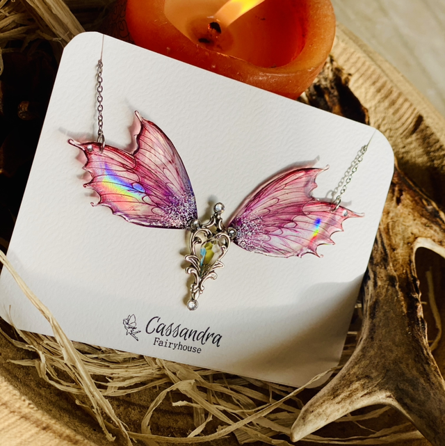 Les ailes sont sculptées dans la transparence, teintées de couleurs, puis sublimées par de fines chaînettes pendantes, comme les traînées d’étoiles laissées dans leur sillage.