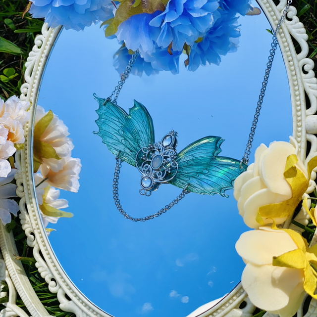 Les ailes sont sculptées dans la transparence, teintées de couleurs, puis sublimées par de fines chaînettes pendantes, comme les traînées d’étoiles laissées dans leur sillage.