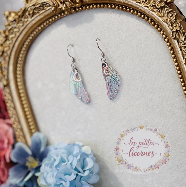 des couleurs irisées, des ailes lumineuses, des petites lunes dorées, des paillettes délicates et des nuances pastel qui changent selon la lumière, comme un prisme magique 🌈🌙