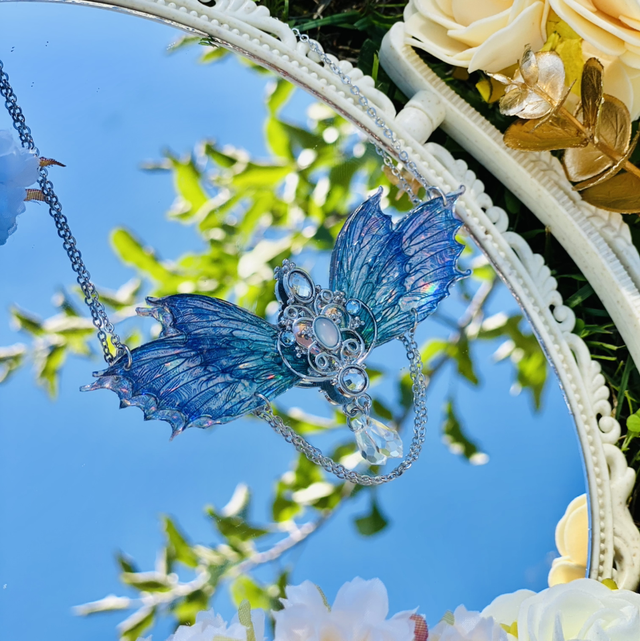 Les ailes sont sculptées dans la transparence, teintées de couleurs, puis sublimées par de fines chaînettes pendantes, comme les traînées d’étoiles laissées dans leur sillage.